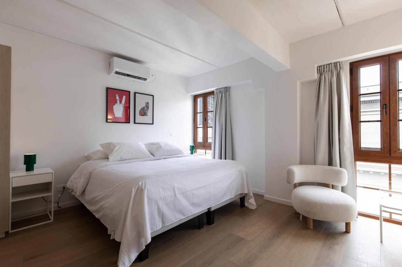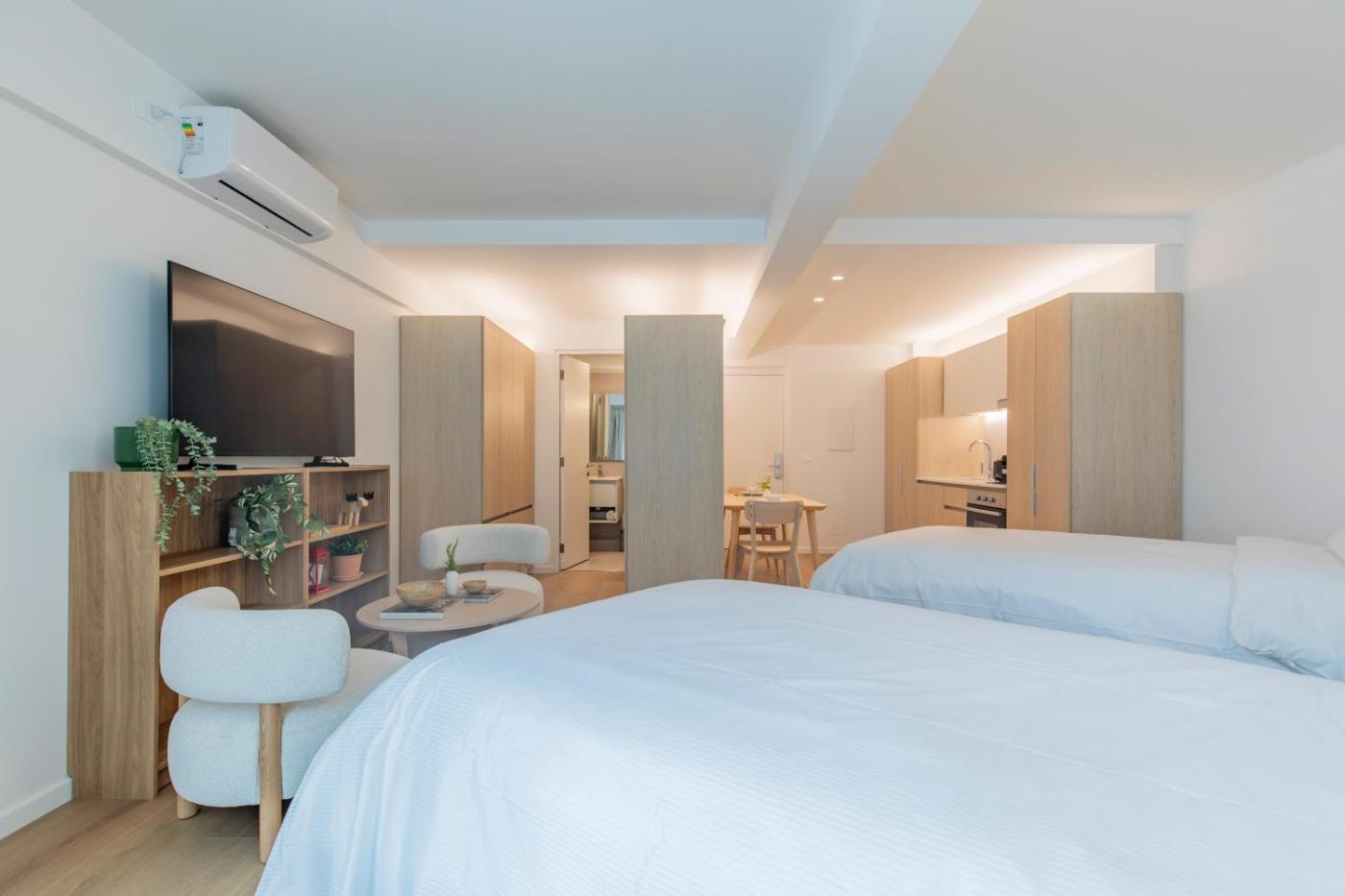 Estudio. The studio has a private bathroom, air conditioning, soundproof walls, as well as a seating area with a flat-screen TV. In the kitchenette, guests will find a stovetop, a refrigerator, kitchenware and an oven. Among the room amenities are a coffee machine, a dining area and a wardrobe as well as city views. The unit has 1 bed. ;